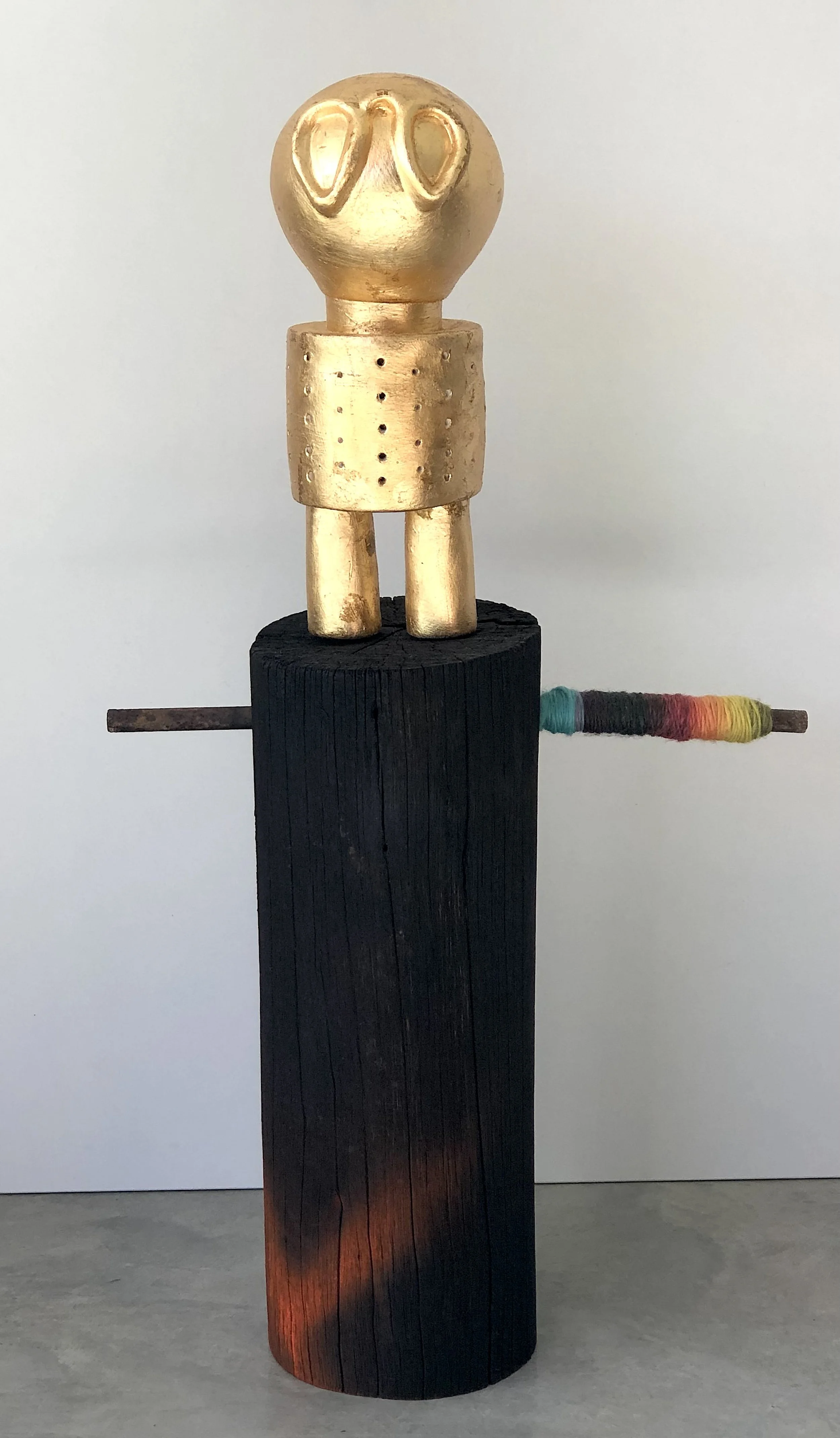 Untitled 2019, Gold leaf, Stoneware, Reclaimed burnt pole, Thread, Dimensions variable